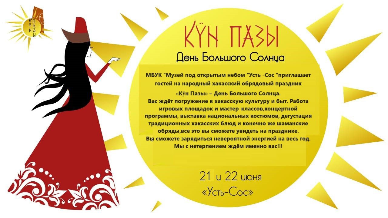 Кун Пазы — День большого солнца. Это один из важнейших праздников хакасского народа, связанный с днём летнего солнцестояния. На протяжении нескольких лет местом скопления жителей региона в эти дни становится Бейская земля. В аале Усть-Сос, у подножия священной горы Хызыл Хая и рядом с сакральным изваянием Алтын Арчол (сын каменной старухи — Хуртуях тас), в степи и у бурной реки Абакан, люди общаются, слуша-ют музыку, пробуют национальные блюда, а главное — участвуют в обряде очищения, проводимом шаманом.