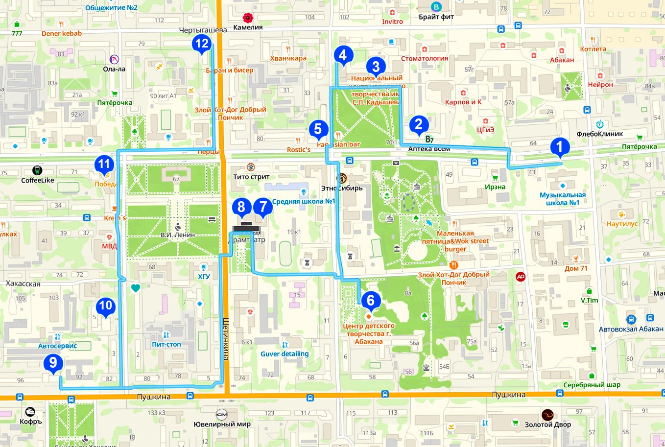 Маршрут включает 12 зданий – учреждения культуры, институты, дома, где жили известные деятели искусства. На фасадах установлены таблички с QR-кодами, которые ведут на страницы объектов в 2ГИС. Там можно прочитать историю здания, послушать аудиогид или посмотреть фотографии.